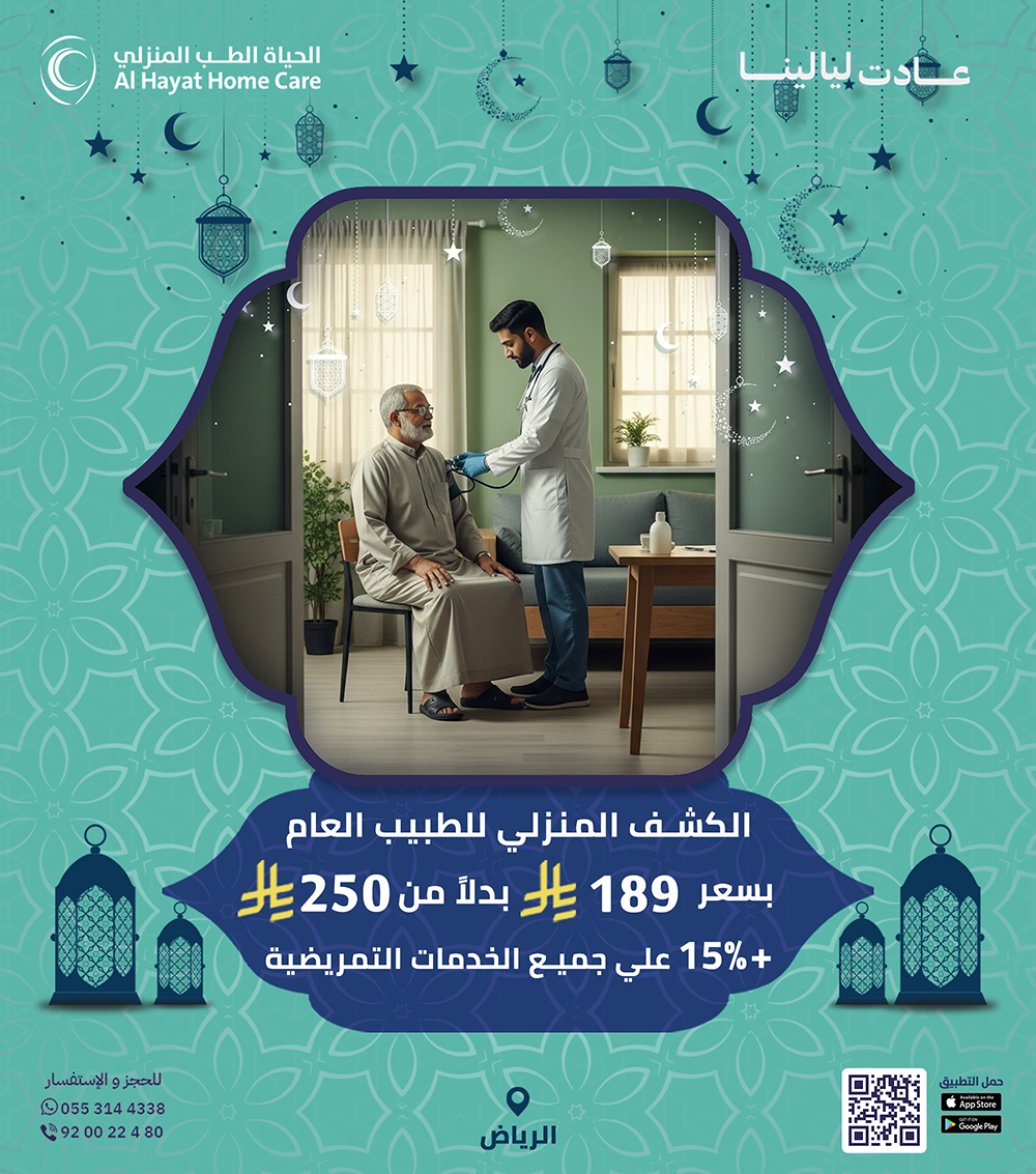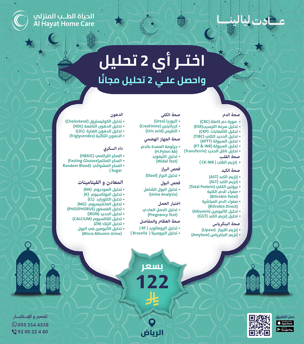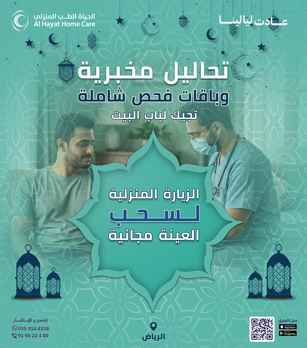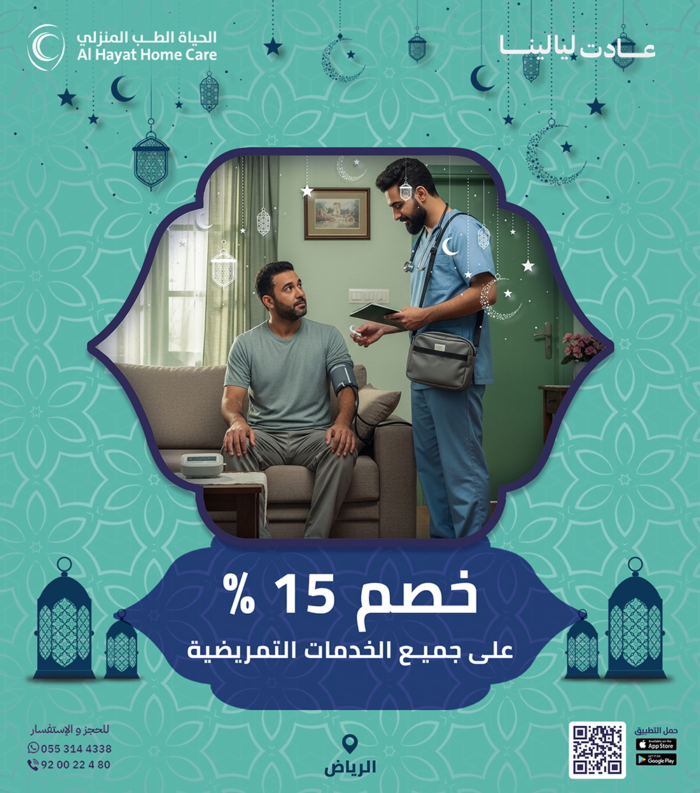 بدل لا تتعب بالمشاوير والانتظار، الحياة للطب المنزلي توفّر لك خدمة الرعاية الطبية المنزلية بكل سهولة. طبيب منزلي، تمريض منزلي، علاج طبيعي بالمنزل، وتحاليل منزلية… كل شي نجيك فيه للبيت ضمن عروض رمضان.